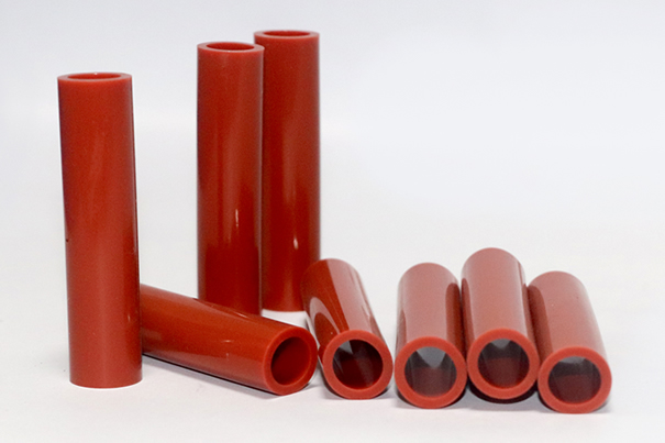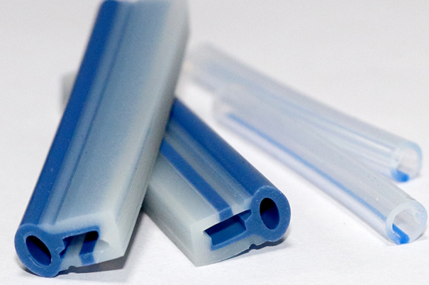 擠出機(jī)頭也是產(chǎn)品的截面形狀,有一定長度,在力與溫度的作用下,機(jī)頭出來產(chǎn)品經(jīng)過高溫硫化成型。此工藝成型的產(chǎn)品一般是條形的產(chǎn)品,產(chǎn)品截面可以各種各樣。譬如,矩形長條,環(huán)形硅管,等.